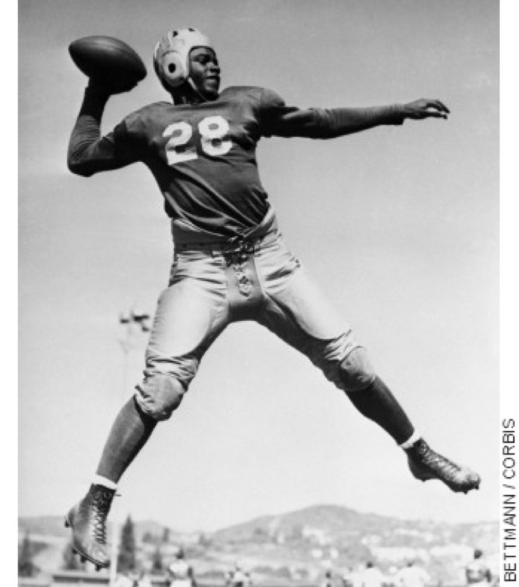 Jackie Robinson as quarterback at UCLA; he was the college’s first student athlete to earn varsity letters in four different sports.