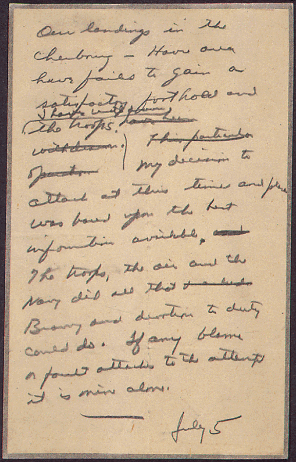 Our landings in the Cherbourg-Harve area have failed to gain a satisfactory foothold and I have withdrawn the troops. My decision to attack at this time and place was based upon the best information available. The troops, the air and the Navy did all that bravery and devotion to duty could do. If any blame or fault attaches to the attempt it is mine alone.